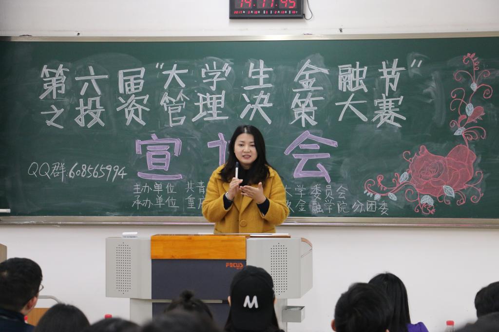 会议伊始,徐阔老师致辞并预祝同学们能在比赛中取得优异的成绩。而后,有着丰富经验的陈晓莉老师从参加大赛的目的到大赛取胜的关键对参赛者们进行了专业的指导和培训。在决策报告编写的问题上,陈晓莉老师从项目概况介绍、项目面向群体、项目资金估算评价、财务分析、市场调研、项目风险等多方面具体、详尽地进行讲解,为参加在场的同学们指点迷津。上届投资管理决策大赛获奖者张阳学长也向同学们分享了自己的参赛心得,并感言:“比赛过程虽曲折,但收获颇丰。”最后,财金公司分团委员工会主席颜荣伸为大家介绍了比赛规则以及赛程安排,至此宣讲会圆满结束。
