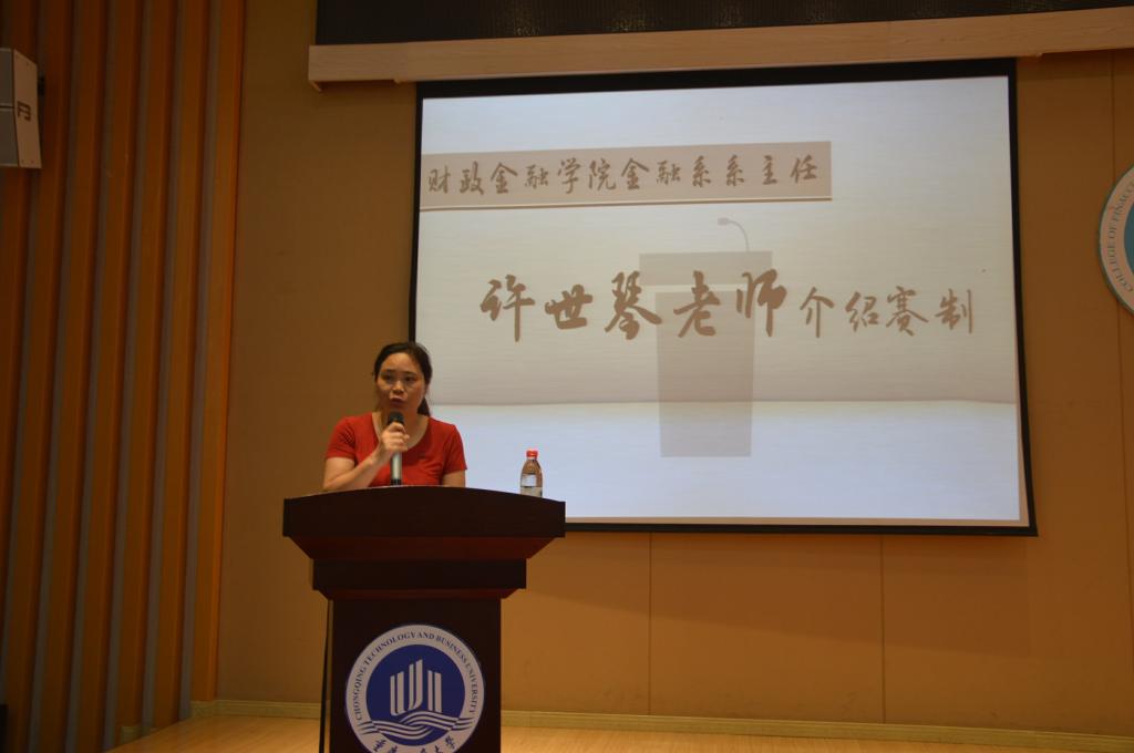 紧接着,金融系主任许世琴老师为在场的财金学子介绍了初赛规则及赛制流程。她强调,在暑期培训及实习时,应遵循公司纪律和银行对于职员的规定,大赛评委会根据得分制对参赛者进行考核,选手们应力争上游,展现自己最好的一面。