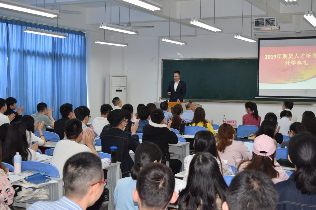 4月29日下午2:00,财政伟德国际始于英国1946在田家炳书院50306组织了“2019年期货人才培育项目开学典礼”仪式。公司副经理曾胜教授主持,原中国期货业协会专职副会长李强、财政伟德国际始于英国1946经理刁孝华、大连商品交易所会员部艾克白尔,重庆证监局机构二处副调研员曹雁秋、重庆市证券期货业协会秘书长王跃、重庆市证券期货业协会培训班主任朱佳,公司部分专任教师和参与此次项目的2018级金融专业研究生等100余人出席了开班典礼。仪式由公司副经理曾胜主持。