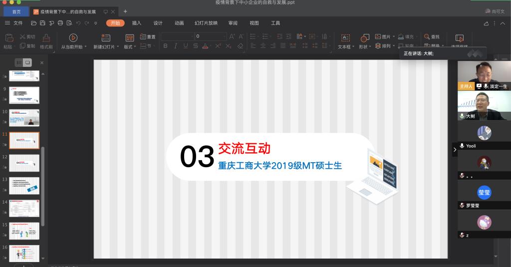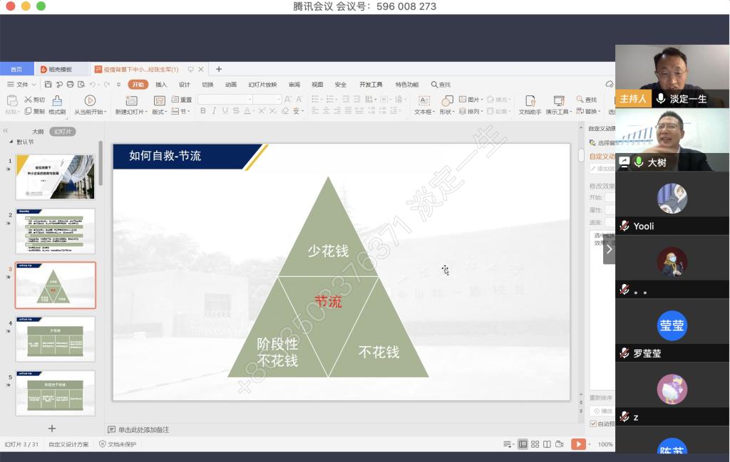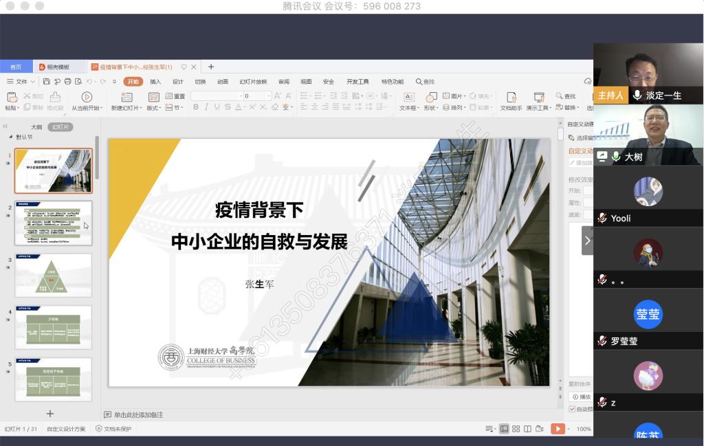 4月9日晚上,公司税务硕士教育中心通过腾讯会议成功举办了本年度第一次南山税务沙龙——疫情背景下中小企业的自救与发展。本次沙龙由伟德国际尚可文教授主持,特邀请迅驰车业江苏有限公司副总裁、上海财经大学硕士生导师张生军博士主讲,公司2019级税务硕士研究生参加了沙龙。