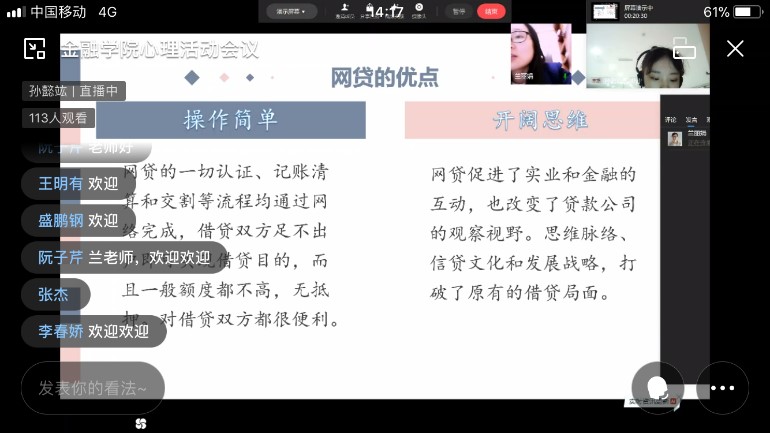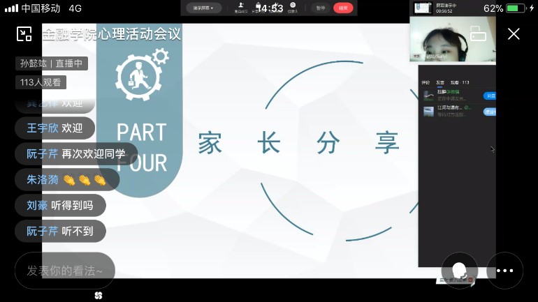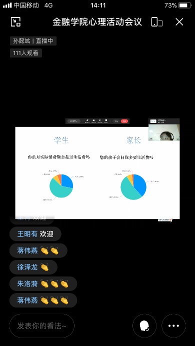 接着三位优秀心理委员代表从自己的日常消费实况,分析了校园网贷能得以发展的原因,并提出了该如何合理规划自己的财务,避免校园贷在自己及身边的同学之间发生的建议。在线参与活动的家长纷纷敞开心扉,积极踊跃发言,畅谈如何与孩子增进交流,如何及时帮助孩子摆脱高利贷的陷阱,以身作则,做好孩子的榜样和表率。