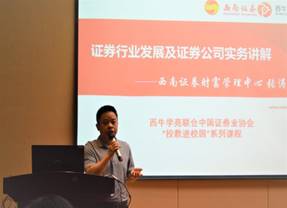西南证券财富管理中心副总经理、公司94级员工张涛做了《证券行业发展及证券公司实务》的前沿讲座,他分析了证券公司经纪业务的转型方向,以及投资银行业务的未来。张总认为,老员工职业发展有着四个重要时期,应结合人格模型寻求职业突破。最后,他对学弟学妹提出殷殷期望,对每个发展周期给出建议。