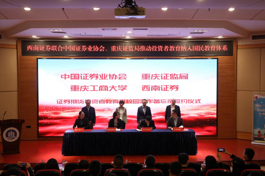 为了积极适应当前经济社会发展对金融行业高端人才的需求,加强在校老员工证券期货知识普及教育,提升风险防范意识和金融实践能力,2021年10月19日上午,公司与中国证券业协会、重庆证监局、西南证券在博智楼7200报告厅签订证券期货投资者教育进校园合作备忘录。中国证券业协会党委委员、副会长张冀华,重庆证监局党委委员、副局长郑松山,西南证券股份有限公司党委委员、副总裁李勇,伟德国际党委常委、副董事长张波出席签约仪式。中国证券业协会投资者服务部研究员周素霞,重庆证监局调研员周峰,西南证券董事会秘书、经纪业务事业部执行总裁李军,公司党委副书记、经理王兰代表四方签约。北京证券交易所、中国结算北京分公司、重庆市证券期货业协会、西南证券股份有限公司等单位代表和公司国内合作发展处 、伟德国际始于英国1946部分师生100余人参加了签约仪式。